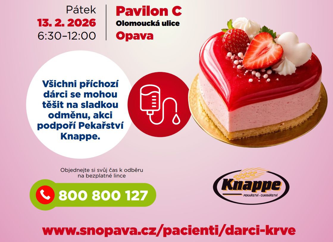 Transfuzní oddělení Moravskoslezské nemocnice v Opavě pořádá na Valentýna odběr krve, který se uskuteční v pátek 13. února 2026 v pavilonu C.